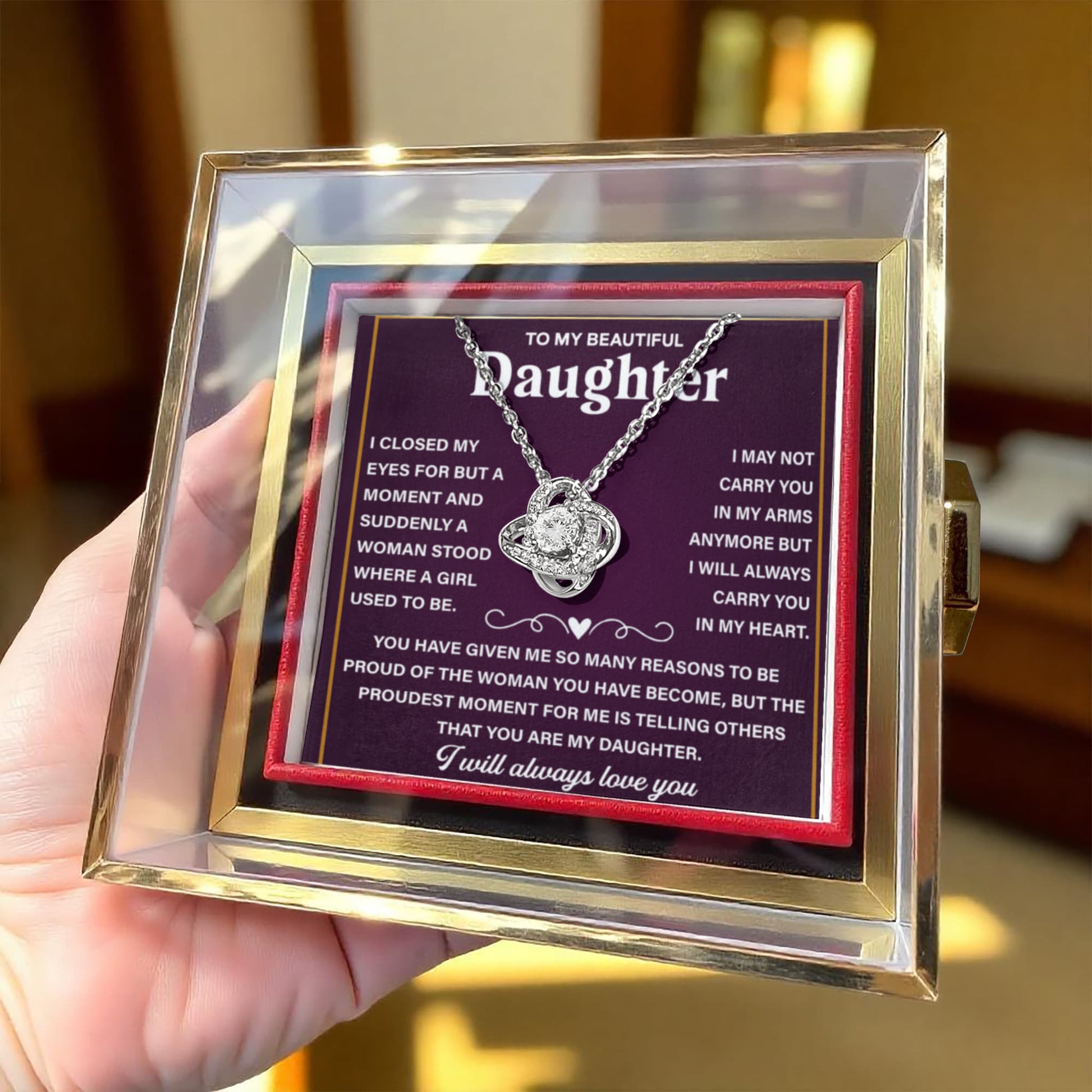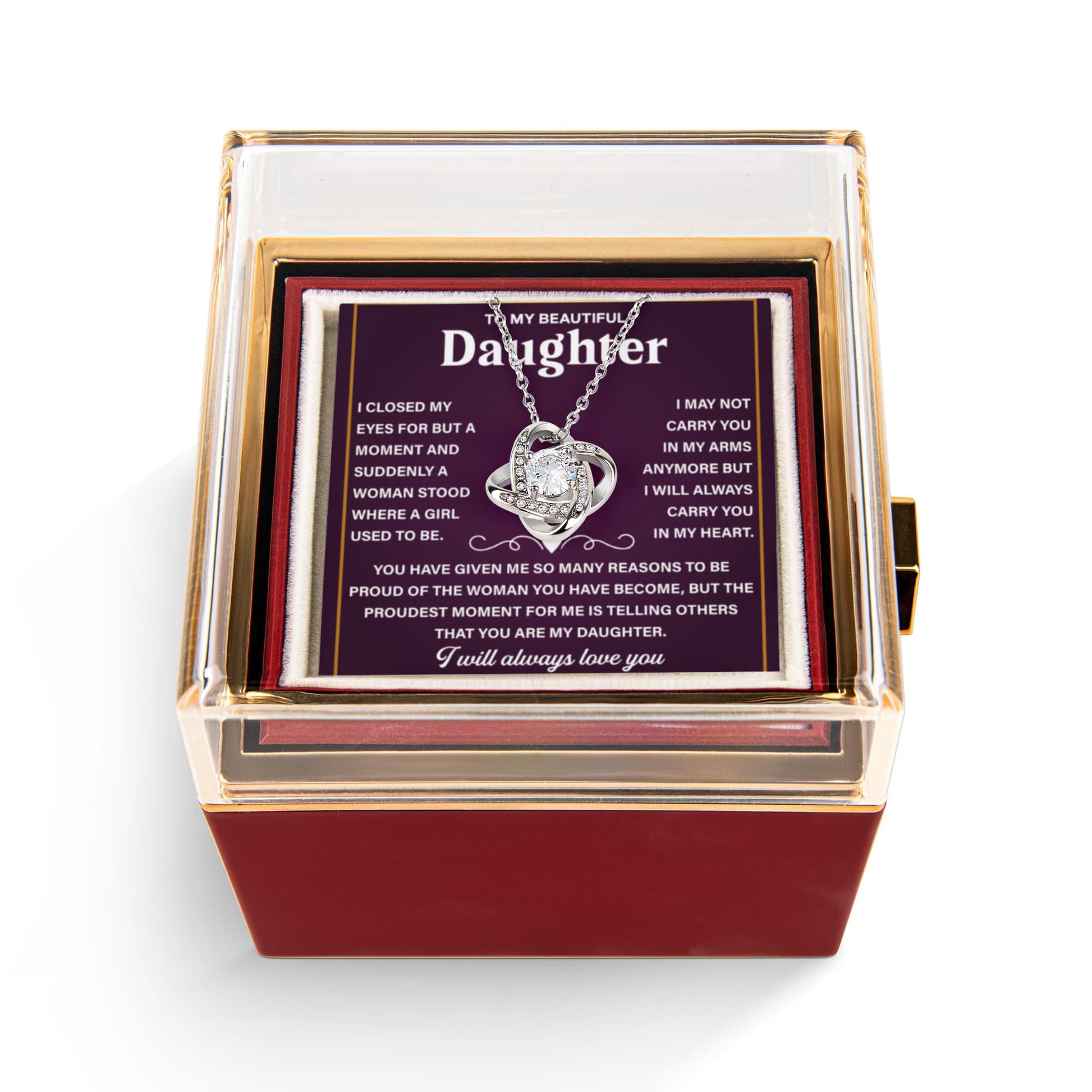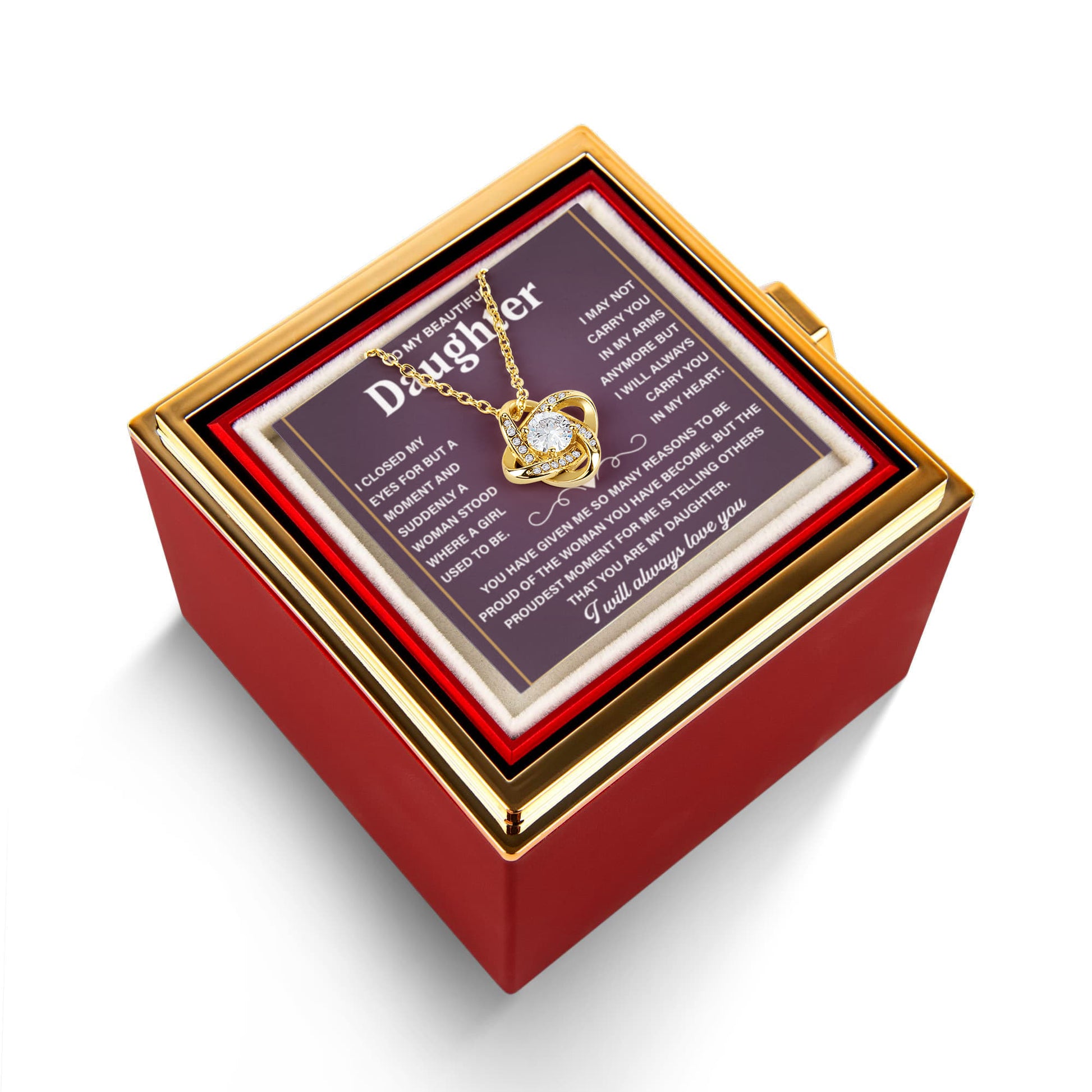 Imagine her reaction as she receives this beautiful Love Knot Necklace. Representing an unbreakable bond between two souls, this stunning pendant is adorned with premium cubic zirconia crystals, making it a timeless symbol of love and devotion. The luxurious box, featuring a meticulously preserved rose that never fades, adds an extra touch of love. With a simple turn of the gold knob, her breathtaking gift is revealed—making it the perfect sentimental gift for that special someone.