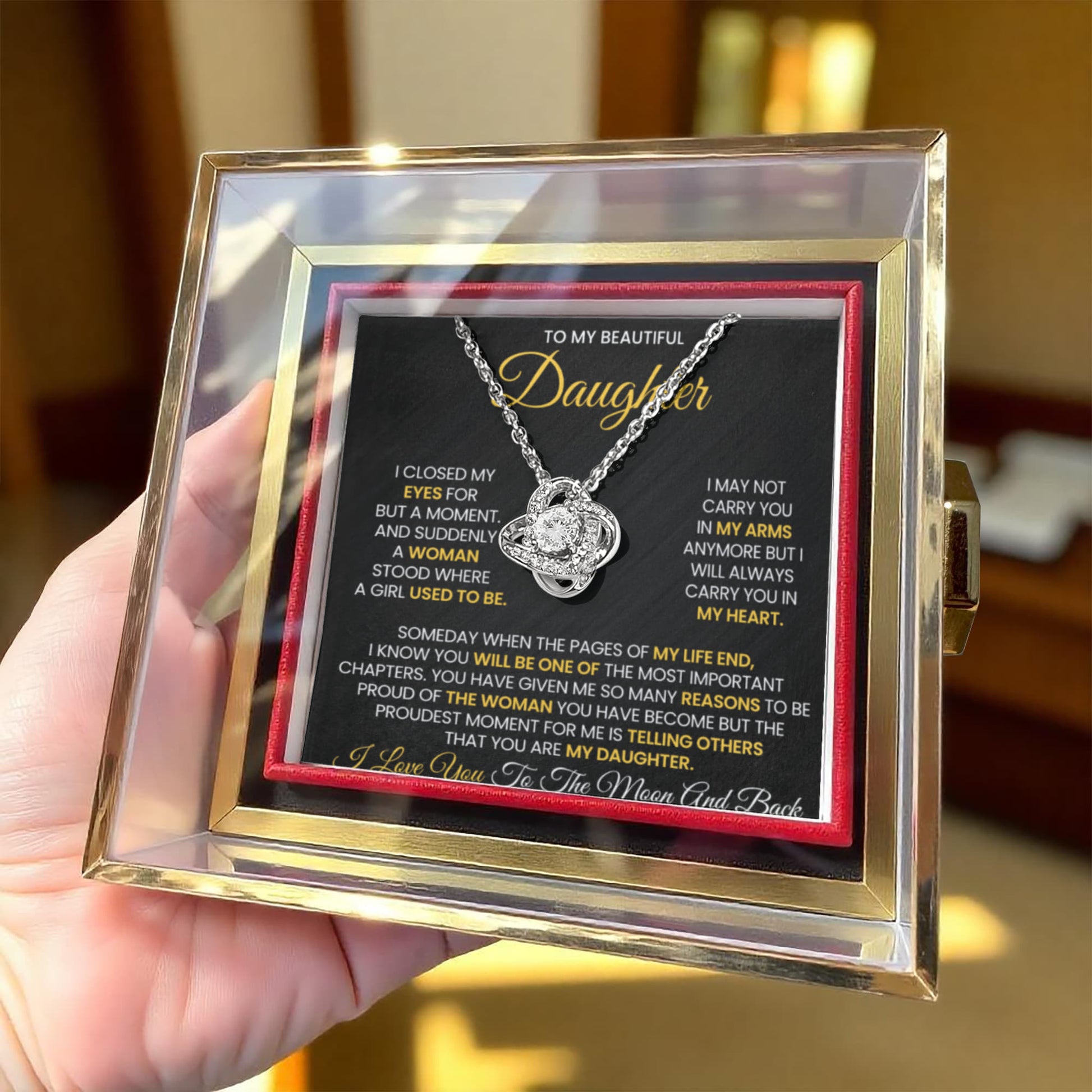 Imagine her reaction as she receives this beautiful Love Knot Necklace. Representing an unbreakable bond between two souls, this stunning pendant is adorned with premium cubic zirconia crystals, making it a timeless symbol of love and devotion. The luxurious box, featuring a meticulously preserved rose that never fades, adds an extra touch of love. With a simple turn of the gold knob, her breathtaking gift is revealed—making it the perfect sentimental gift for that special someone.
